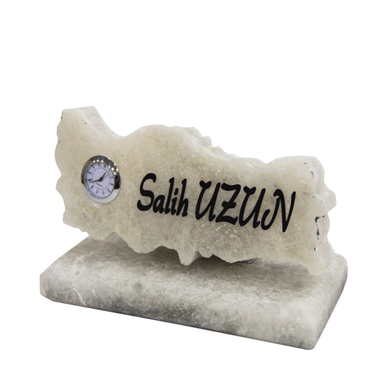 Tamamen Çankırı kaya tuzundan imal edilen Saatli Masaüstü İsimlik hediyelik bir ürün olmakla beraber dekoratif amaçlıdır. Ofisinizde masanıza renk katacak isimlik aynı zamanda yaydığı negatif iyonla havanın kalitesini artıracak. Fiyata isim yazma ücreti de dahildir.